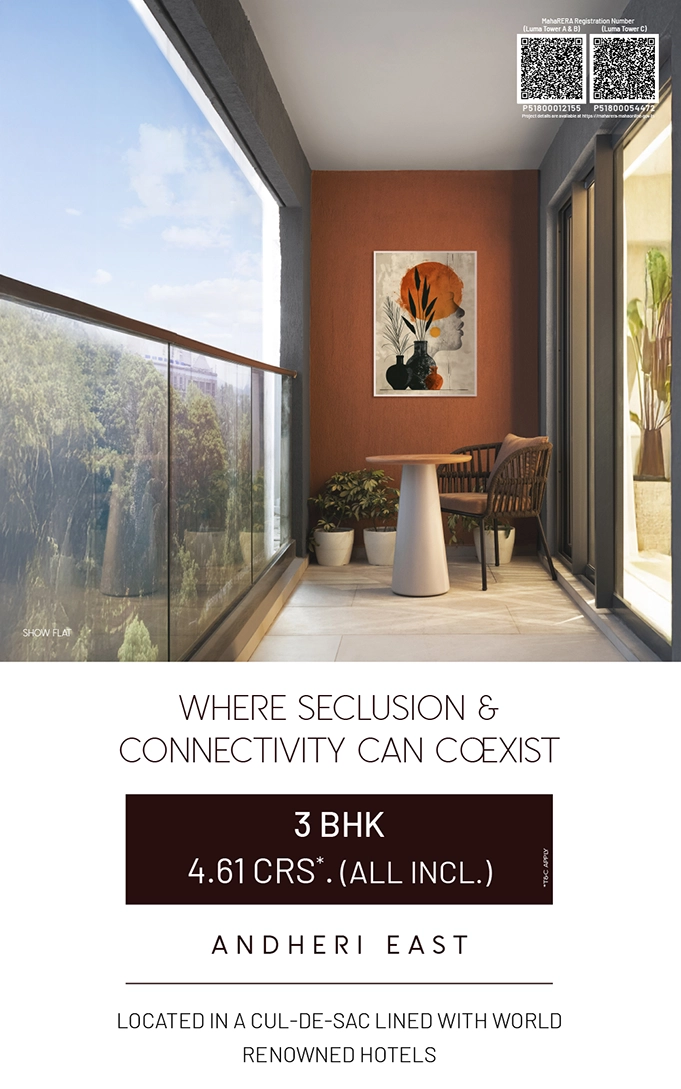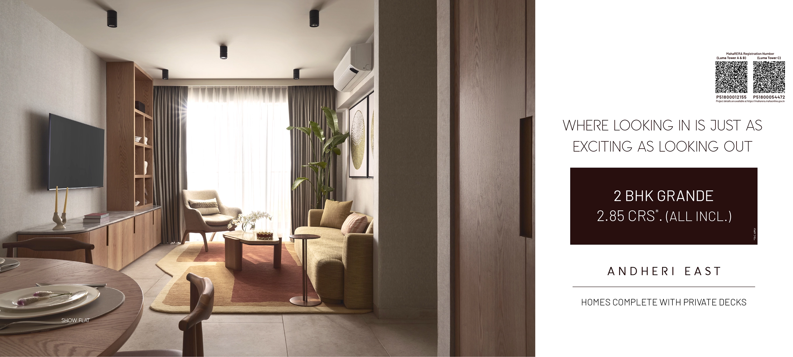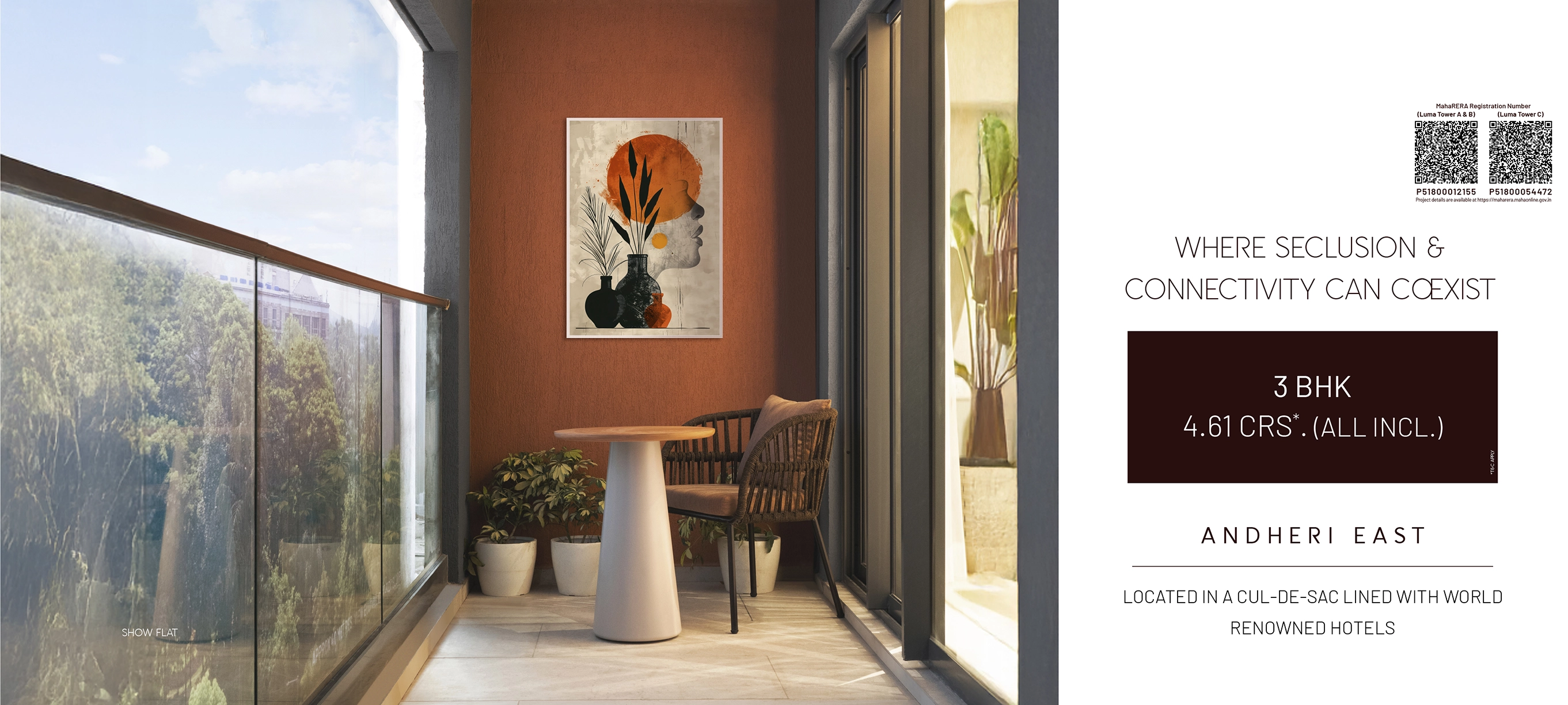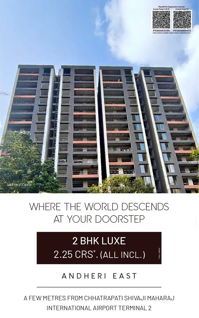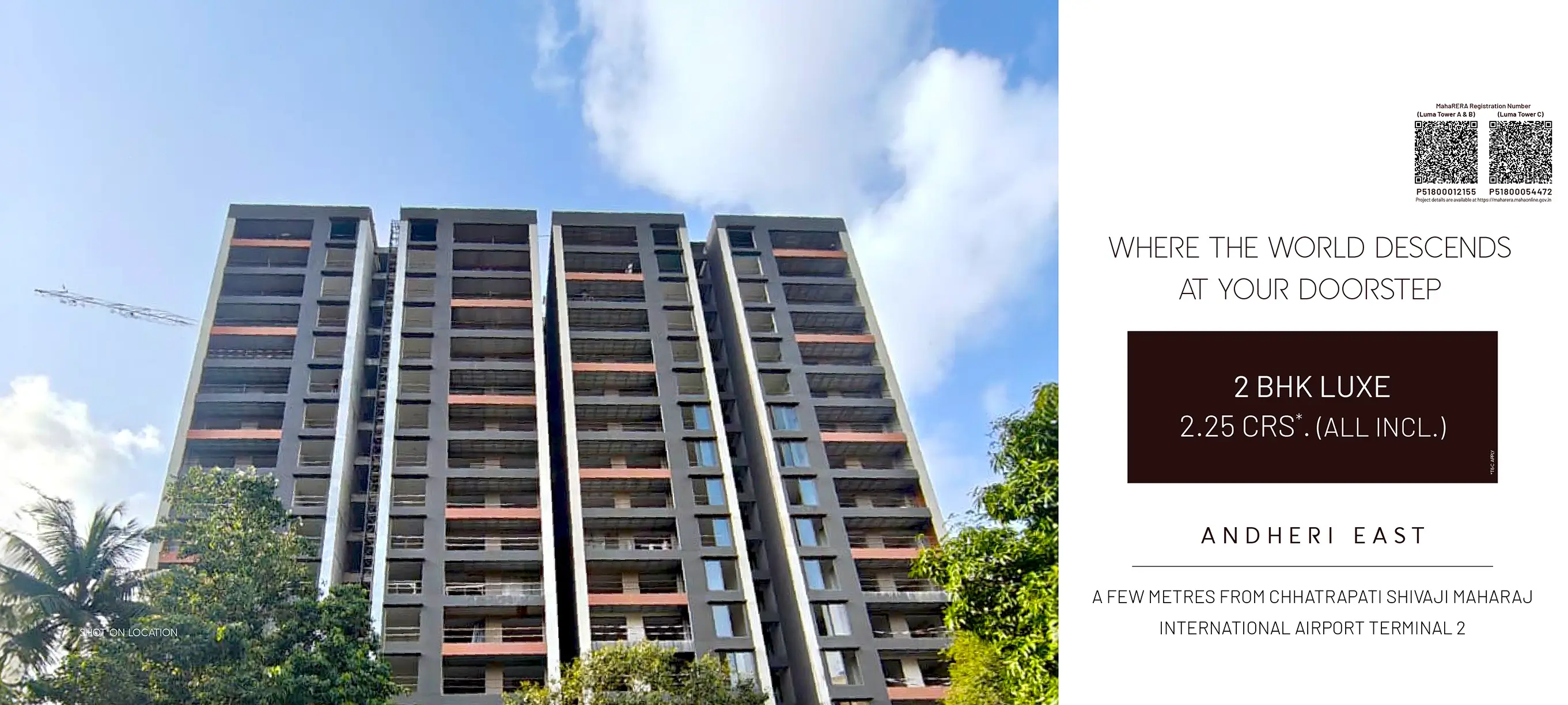 Central to Andheri East's bustling 5-star hotel avenue, your home at Luma is built to give you a glittering vantage point of the city. Step into a world of conveniences at your doorstep, like Chhatrapati Shivaji Maharaj International Airport, the Western Express Highway, and the popular business district of suburban Mumbai. Make the most of Andheri's dazzling nightlife and entertainment, while enjoying the connections to renowned schools, hospitals and malls. See the city in a new light through the lens of Luma.